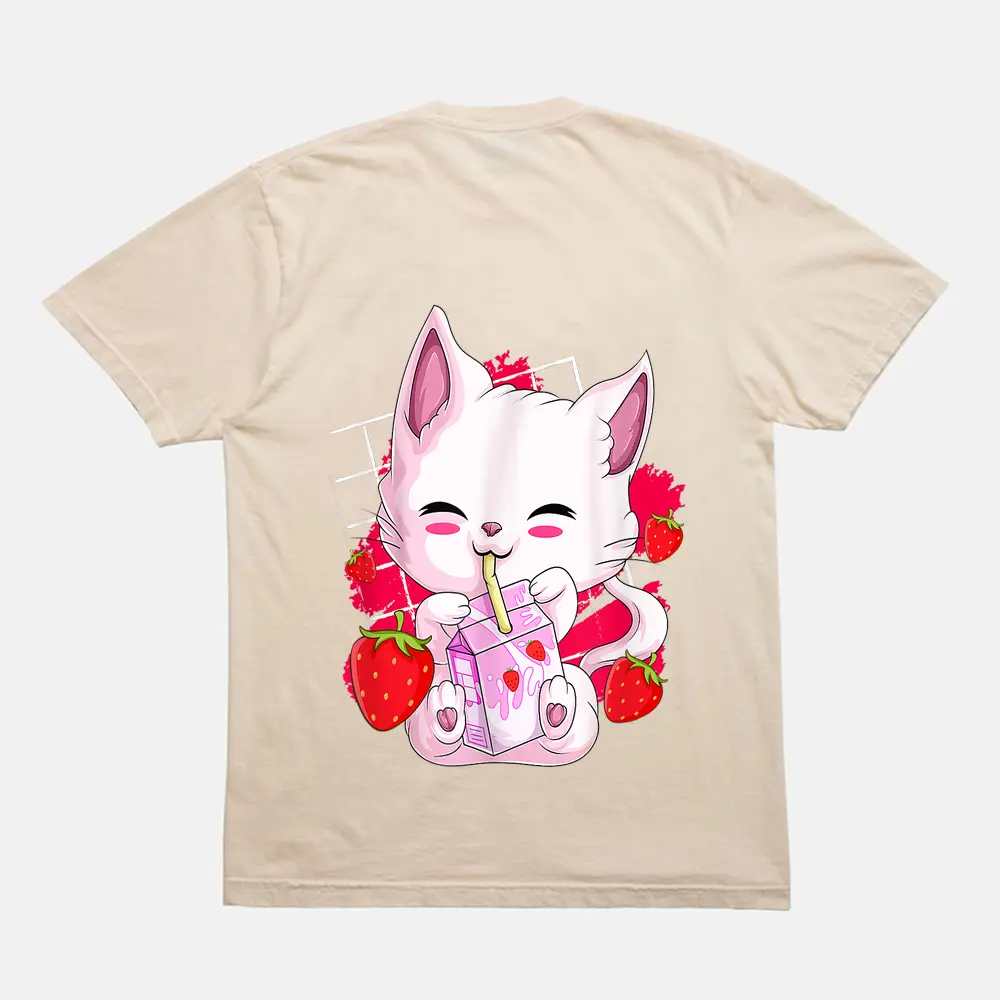 Anime Kawaii Cat Strawberry Milk Anime Neko Gifts Girls Teen T-Shirt – Cream