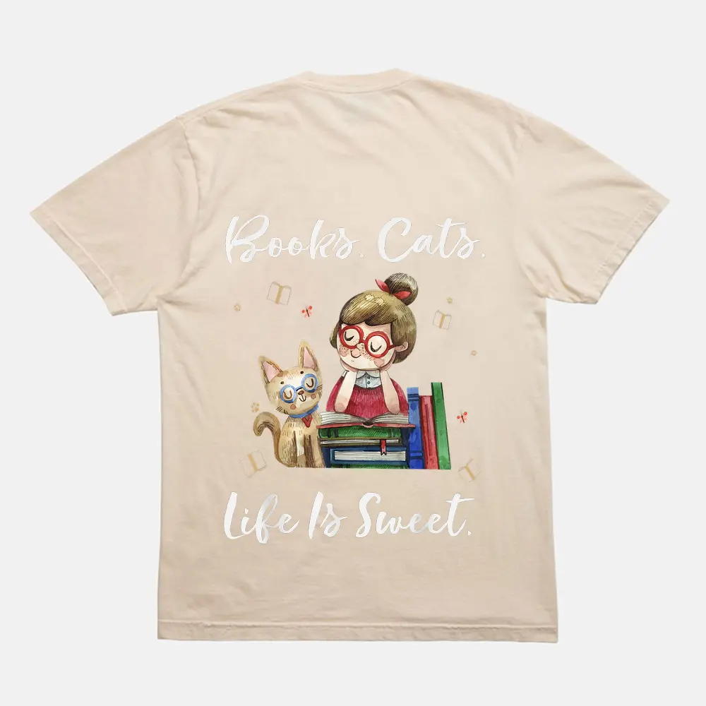 Books Cats Life Is Sweet Cat Book Lovers Reading Book Ver 2 T-Shirt – Cream