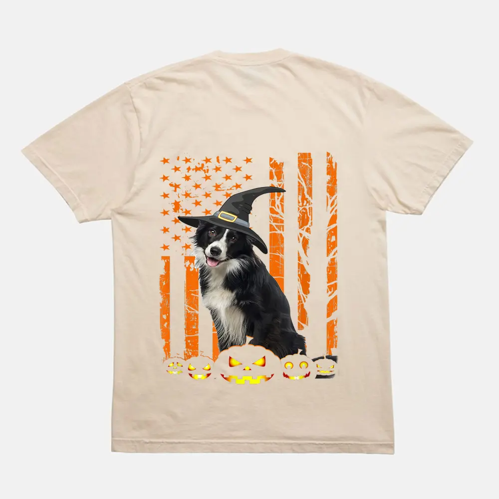 Border Collie Dog Pumpkin American Flag Witch Halloween T-Shirt – Cream