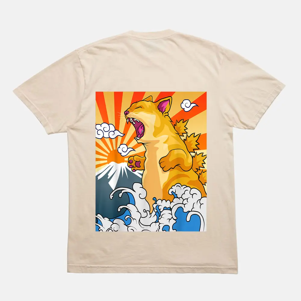 Catzilla Vintage Kawaii Cute Cat Art Japanese Sunset T-Shirt – Cream