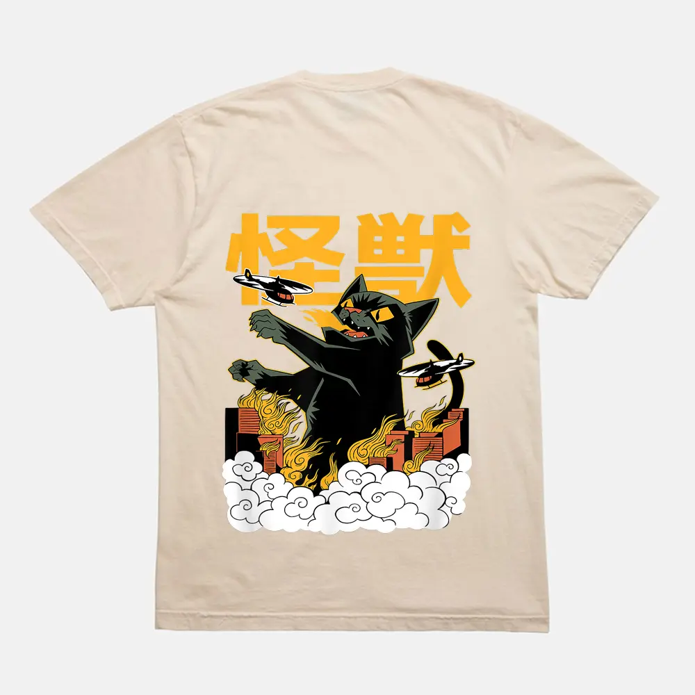 Catzilla Vs Kaiju Vintage Funny Cute Cat Art Japanese Sunset T-Shirt – Cream