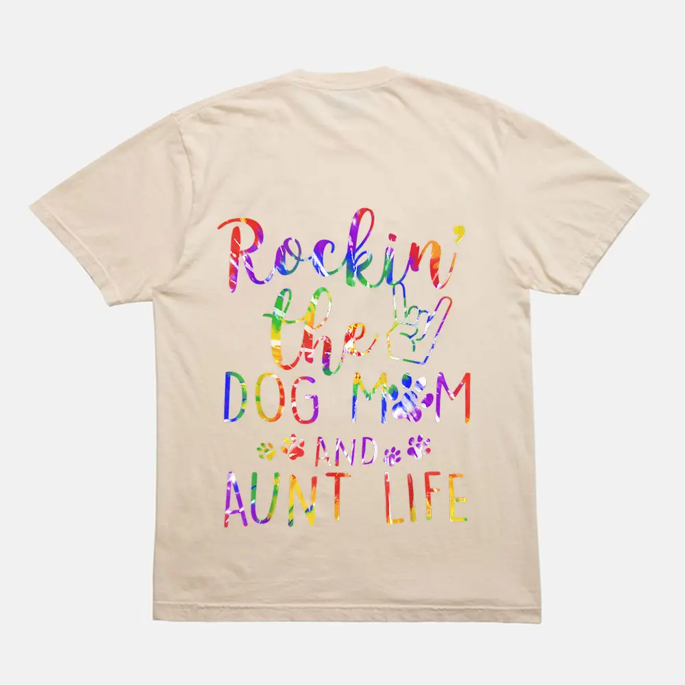Womens Funny Rockin’ The Dog Mom And Aunt Life Tie Dye Lover T-Shirt – Cream