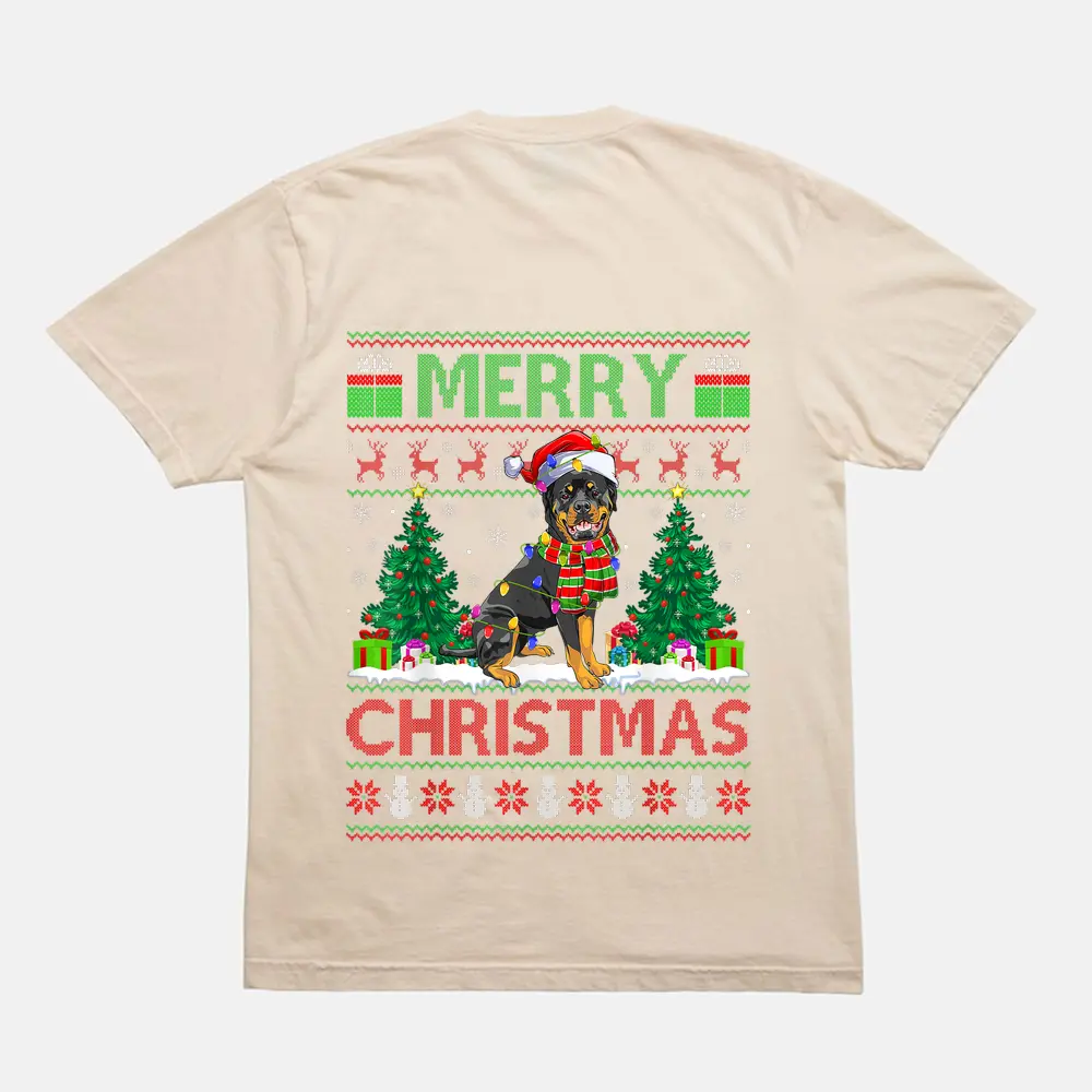 Xmas Tree Lights Ugly Santa Rottweiler Dog Christmas T-Shirt – Cream
