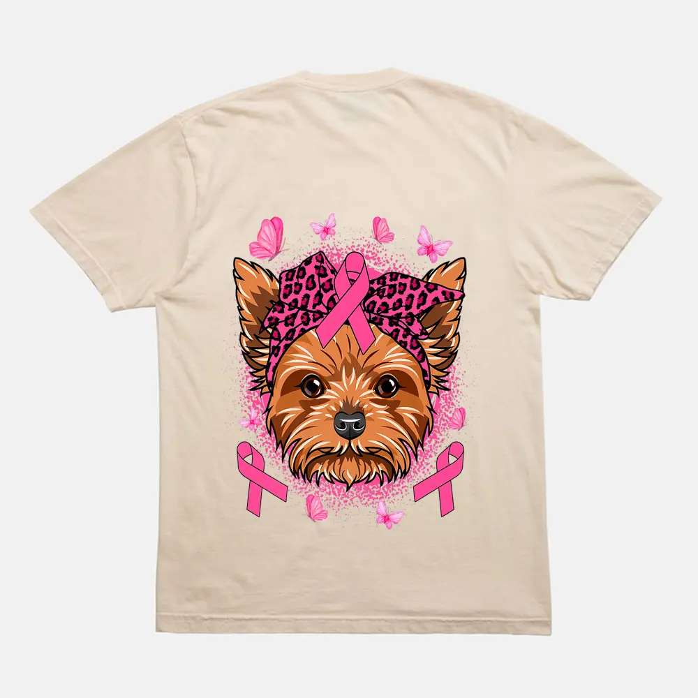 Yorkie Dog Pink Ribbon Breast Cancer Awareness T-Shirt – Cream